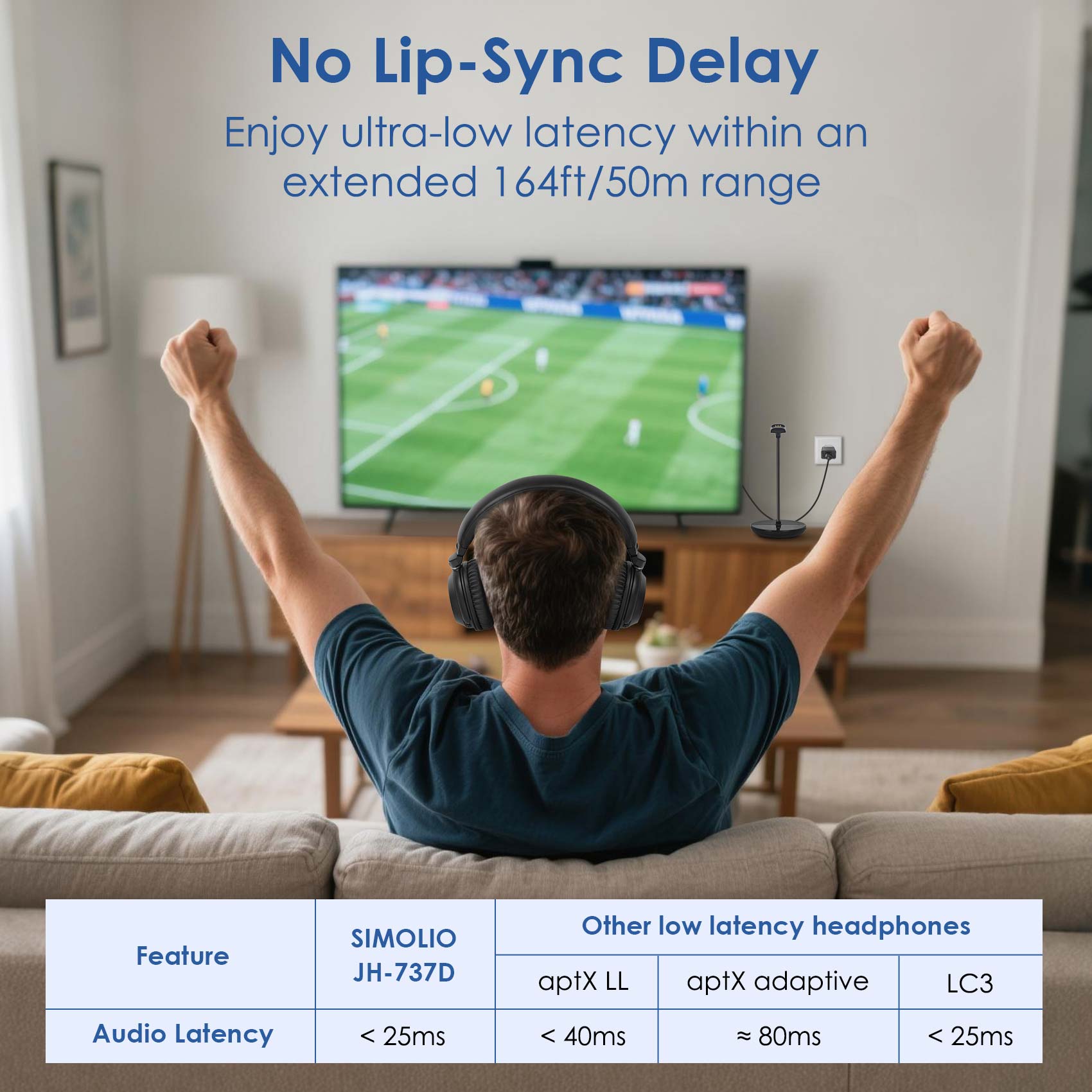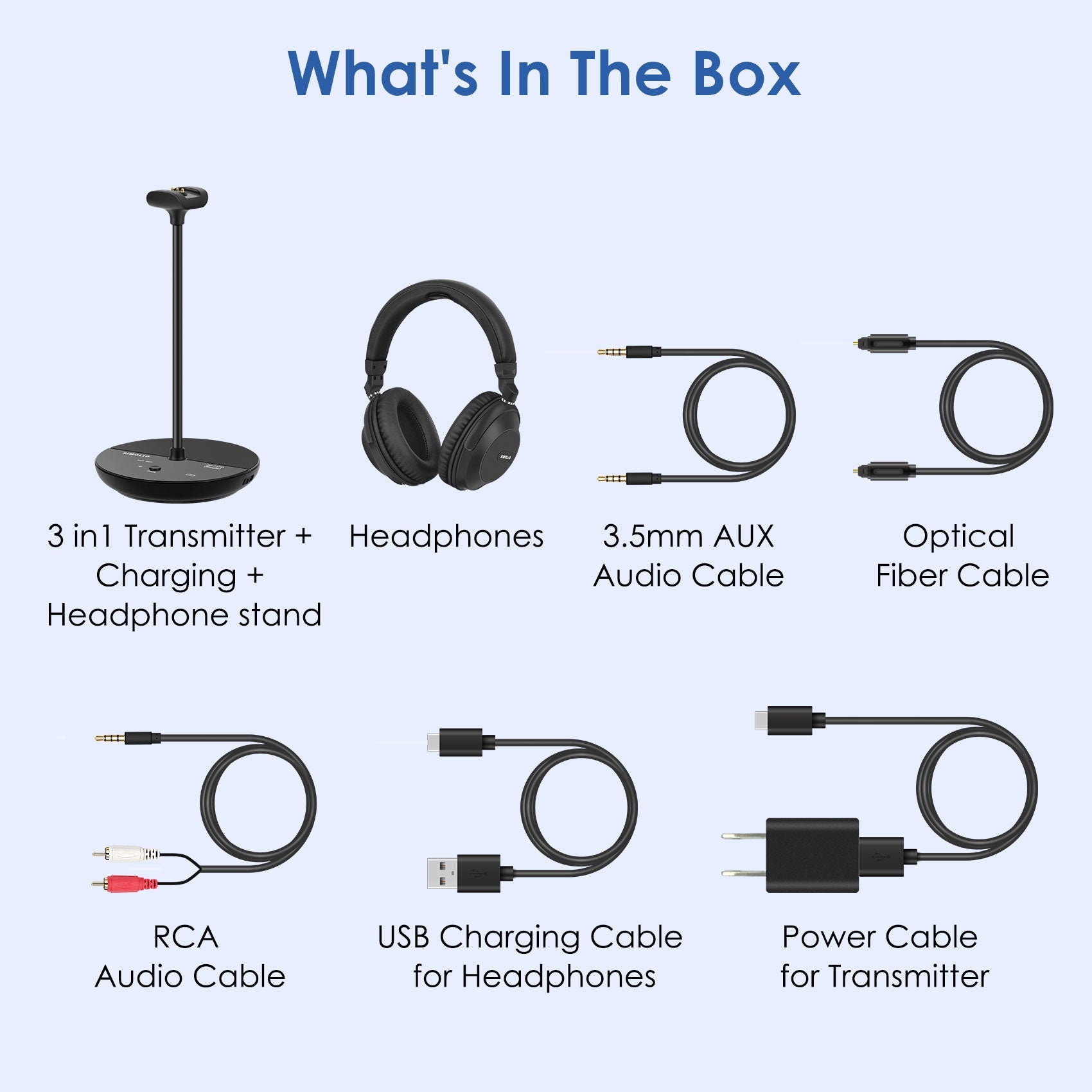 - [Hassle-Free Set Up, Long Transmitting Range] Skip the complicated Bluetooth pairing! Simply plug the wireless transmitter into your TV’s audio output, power on the transmitter and tv listening headphones, and you’re ready to go. With a range of up to 164 feet (50 m) in open air, you can move freely around your home—whether in the kitchen, garden, or garage—without missing a moment of your favorite audio
