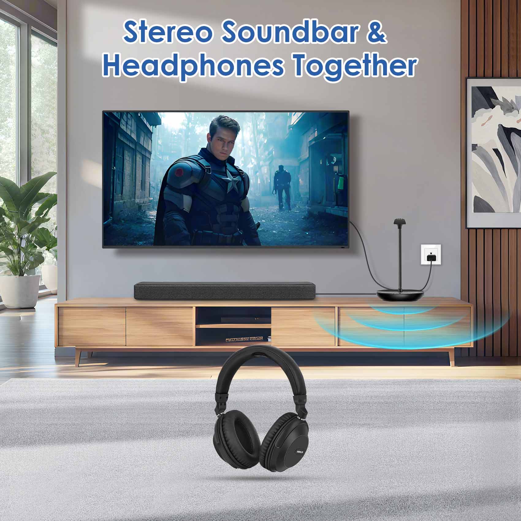 - [TV Headsets Work Together with Your Soundbar / AVR] Thanks to the innovative "bypass" feature, these ear phones for TV can work TOGETHER with your existing soundbar or AV receiver to share the same audio output. You will be able to hear the TV at your own volume through the wireless TV headphones while the others can hear directly through the external sound system at their preferred volume