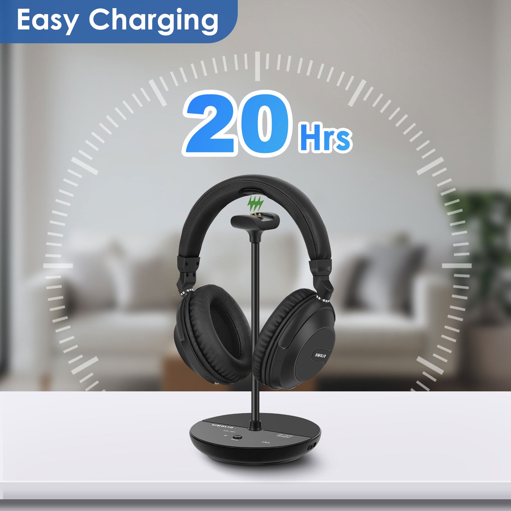 - [Comfort Fit, Convenient Charging, Long Playtime] More than just a headphone holder, the wireless transmitter for TV also serves as a charging dock. You have the option to charge via cable plug-in as well. A full charge provides up to 20 hours of listening time, making these tv listeners an excellent choice for couch potatoes, seniors, and the elderly. Protein earmuffs and retractable soft-padded headband ensure lasting comfort