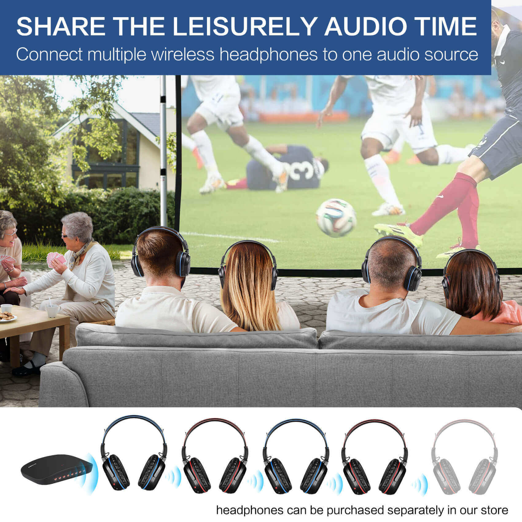 - [Wide Compatibility] This transmitter can be connected to any device that features OPT, AUX, or RCA audio output – such as TVs, projectors, car DVD players, mixer boards, Blu-ray players, and more. Feel free to use it in any scenario where you need multiple headphones connected to the same source.