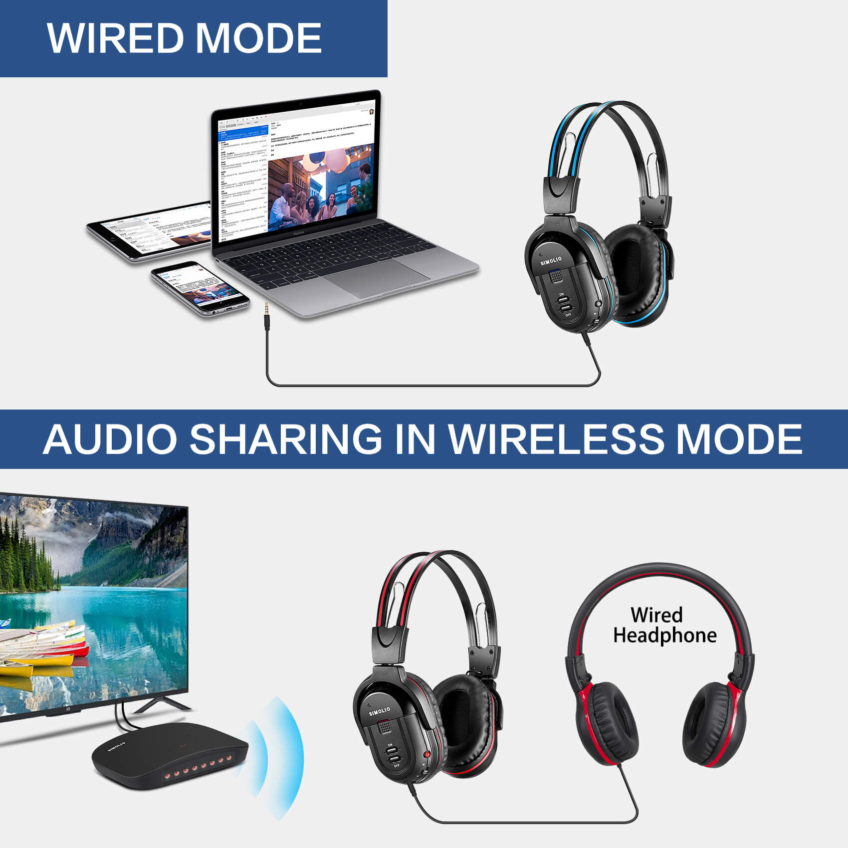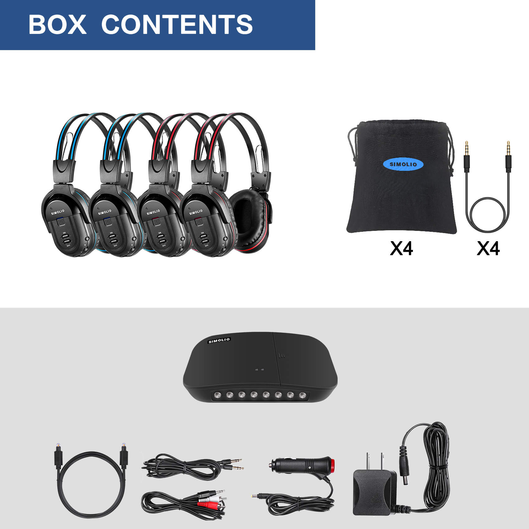 - [Multiple Headphones to ONE Transmitter] The SM-563TV 4Pack wireless TV headphones set includes 4 headphones and 1 transmitter, and you have the option to purchase additional headphones separately (available in our store) and connect them to the same transmitter.